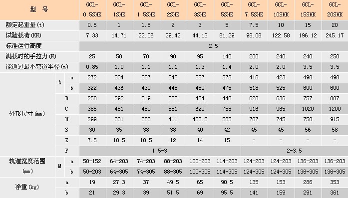 浙江手牌GCL-SHK型手推/手鏈單軌小車技術(shù)參數(shù):