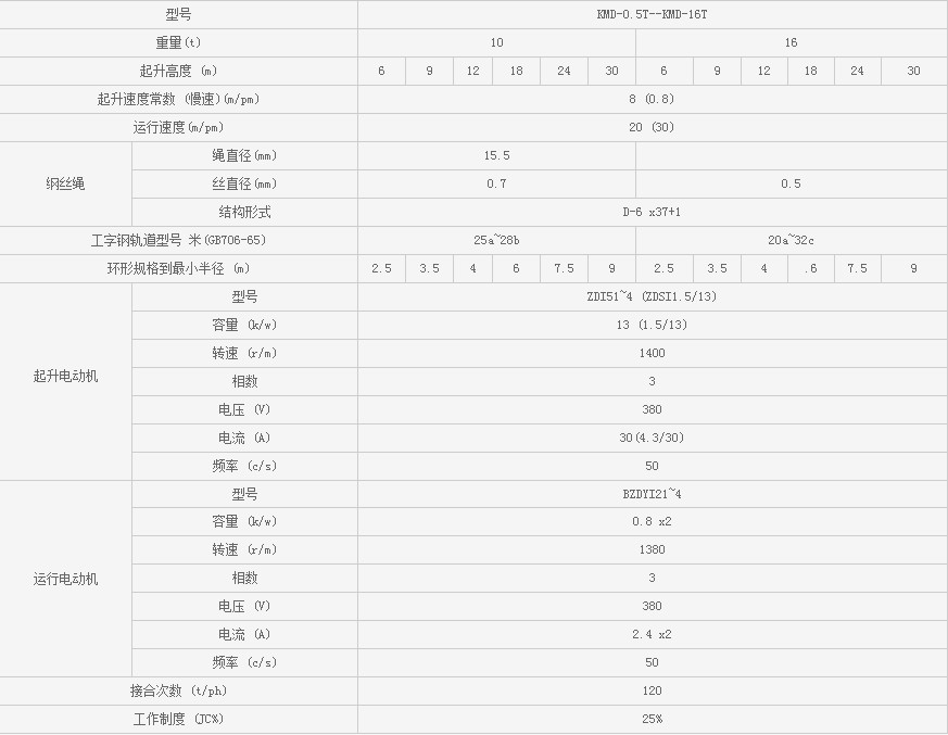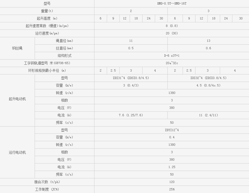 浙江凱勛KMD-0.5T--KMD-16T鋼絲繩電動葫蘆技術(shù)參數(shù):