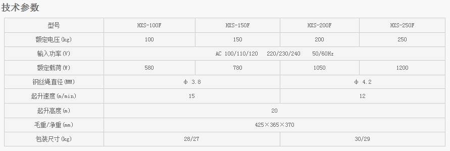 浙江凱勛 HXS-100F--HXS-250F懸掛式微型電動葫蘆技術(shù)參數(shù):