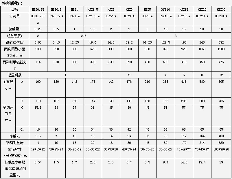 飛鴿HSZ型0.25T-30T A類手拉葫蘆參數(shù):