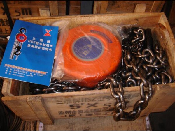 第一張是即將封箱之前的樣子,里面一般都具備完好的手拉葫蘆,手拉葫蘆使用說明書、維修單、合格證明等單子,然后進行封箱工作。